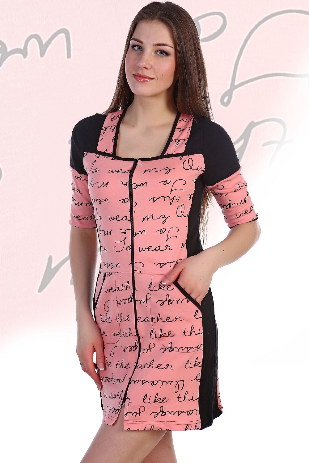Халат на молнии из интерлока пенье. Дизайн в виде рукописных надписей в винтажном стиле, несколько вариантов расцветки - голубая, розовая и сиреневая. Рукава до локтей, длина по середину бедра, по бокам карманы. Размеры от 42 до 52.