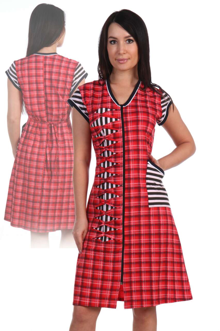 Халат из кулирки, на молнии. Длина приблизительно до колена, рукава короткие. С одной стороны выполнен карман, с другой -- декоративный элемент. Три расцветки -- бирюзовая, розовая и красная. Размеры от 42 до 56.