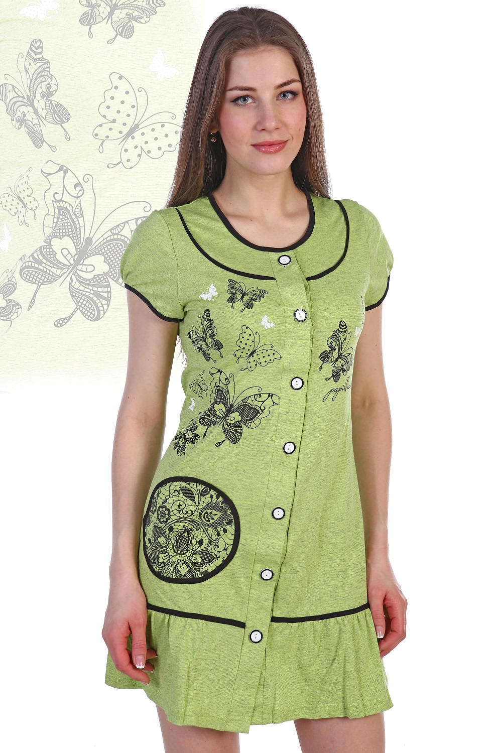 Халат с коротким рукавом на пуговицах. Сбоку круглый карман, принт в виде бабочек. Несколько вариантов расцветки -- кирпичный, бирюзовый, сиреневый и салатовый. Изготовлен из кулирки, размерный ряд от 42 до 52