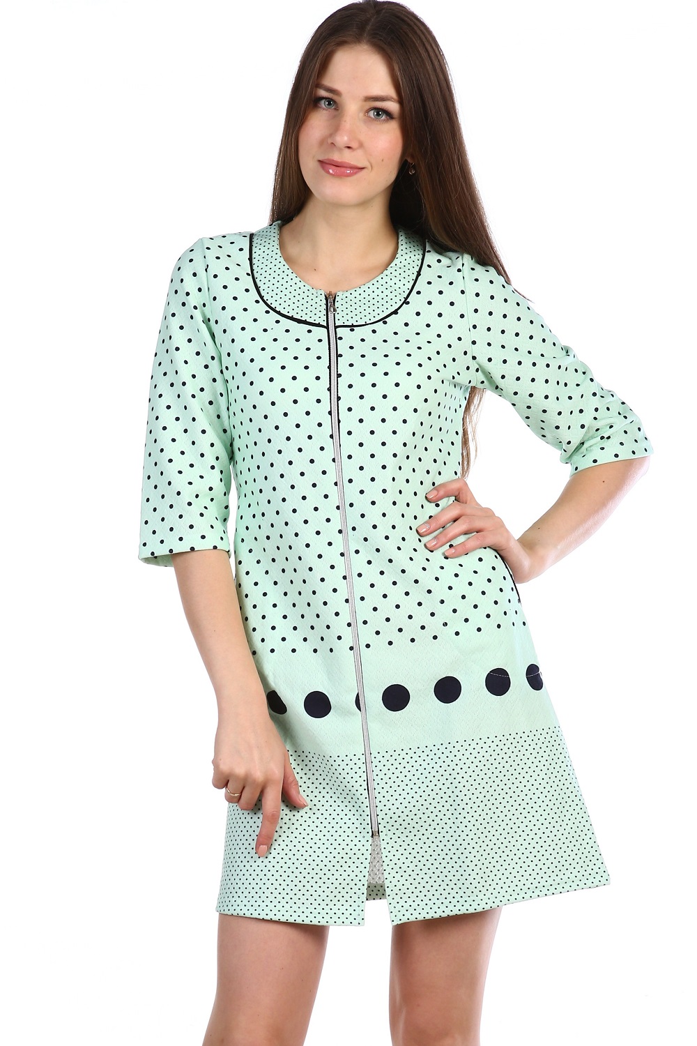 Утепленный халат из капитонии. Декоративное оформление в виде мелкого и крупного черного гороха. Длина чуть выше колен, рукава ниже локтей, по бокам карманы. Два варианта расцветки -- розовая и ментоловая. Размеры от 42 до 54.