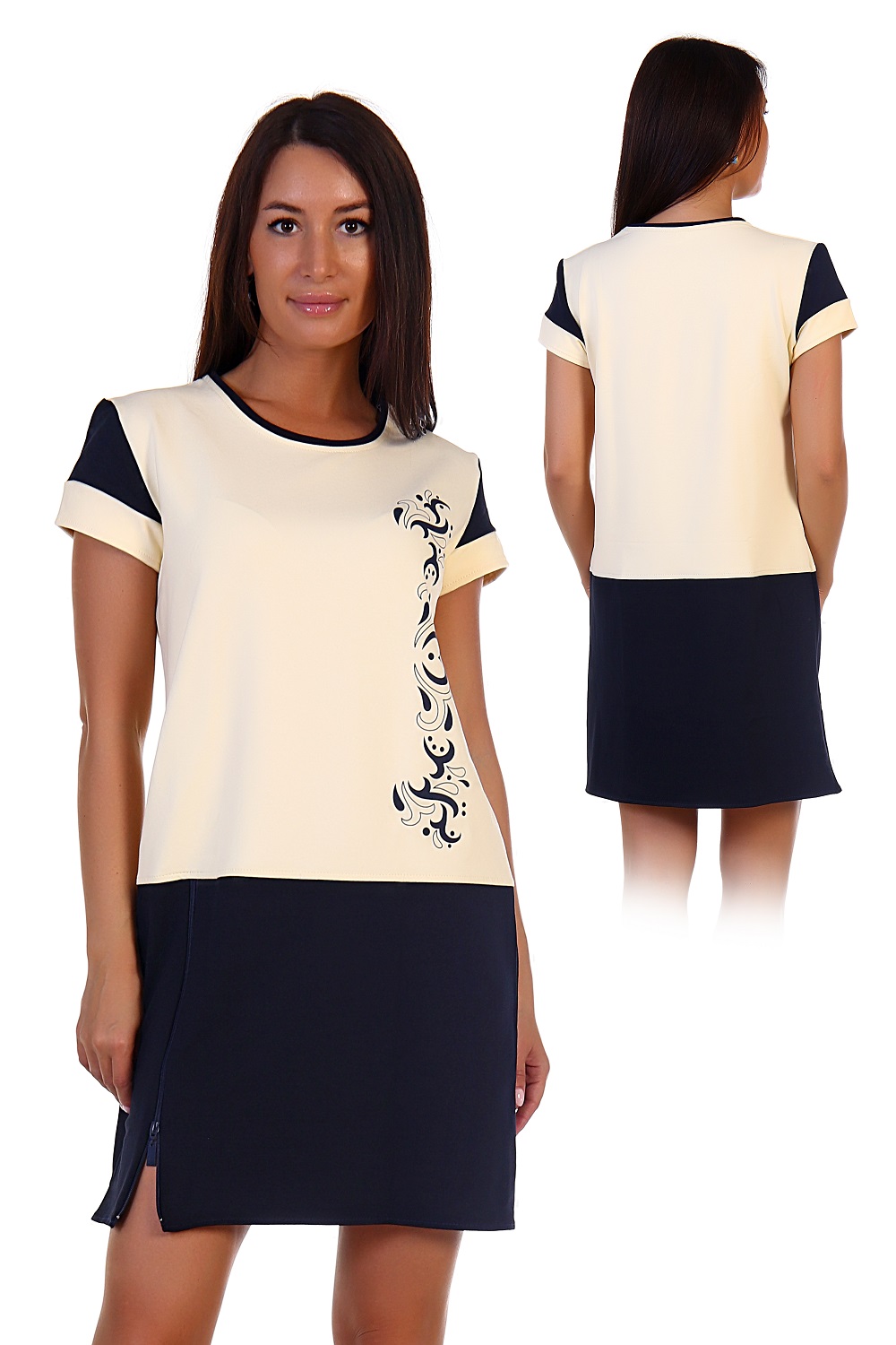 Платье из футера с лайкрой. Короткие рукава, темная юбка и вставки, длина до середины бедра. Принт в виде вертикального узора. Юбка на молнии. Несколько вариантов расцветки. Размеры от 42 до 54.