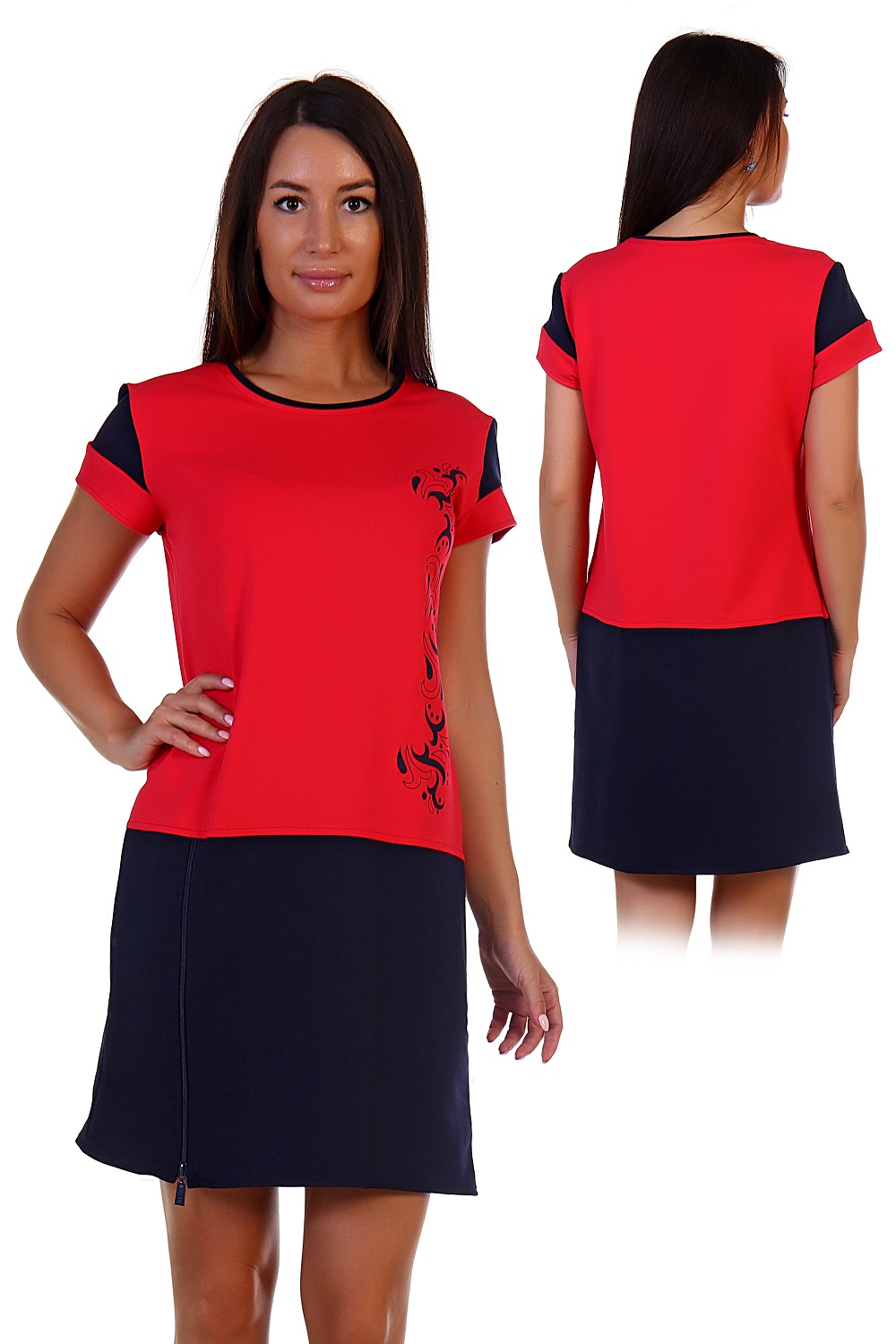 Платье из футера с лайкрой. Короткие рукава, темная юбка и вставки, длина до середины бедра. Принт в виде вертикального узора. Юбка на молнии. Несколько вариантов расцветки. Размеры от 42 до 54.