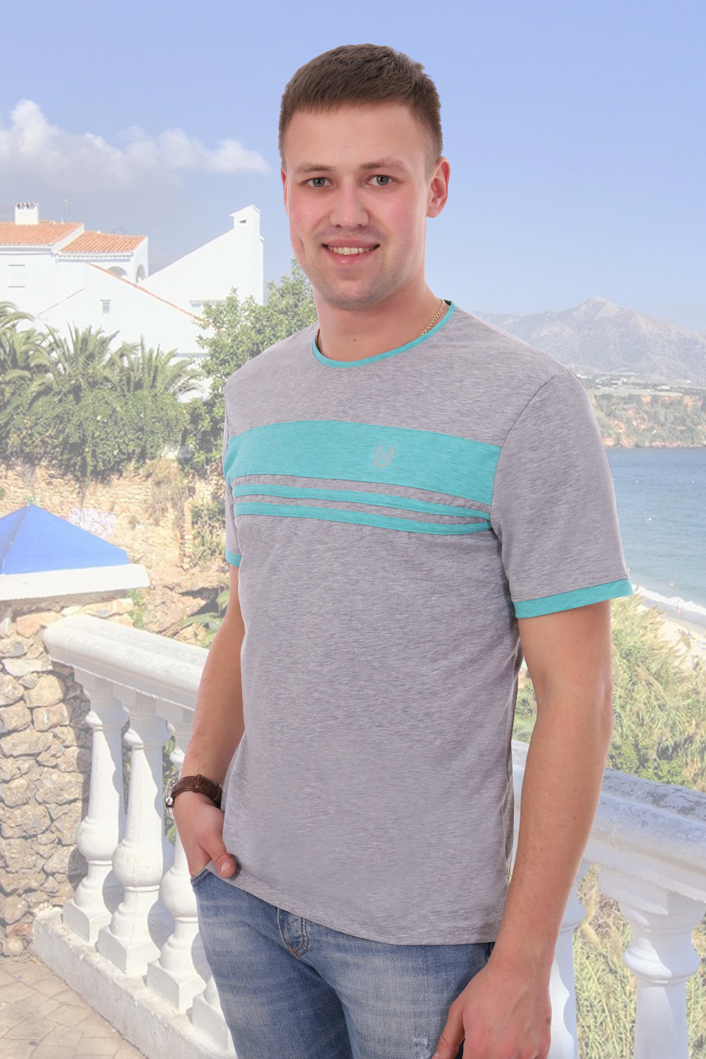 Футболка с круглым вырезом, прямого силуэта, с коротким рукавом. Рукава и горловина обработаны вставками другого цвета. Передняя полочка имеет вставки из ткани другого цвета.