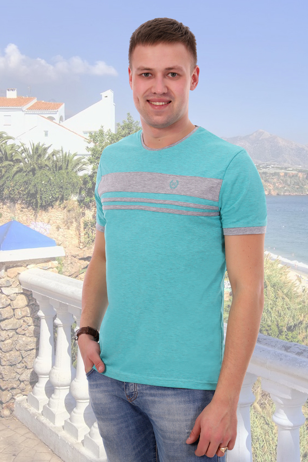 Футболка с круглым вырезом, прямого силуэта, с коротким рукавом. Рукава и горловина обработаны вставками другого цвета. Передняя полочка имеет вставки из ткани другого цвета.