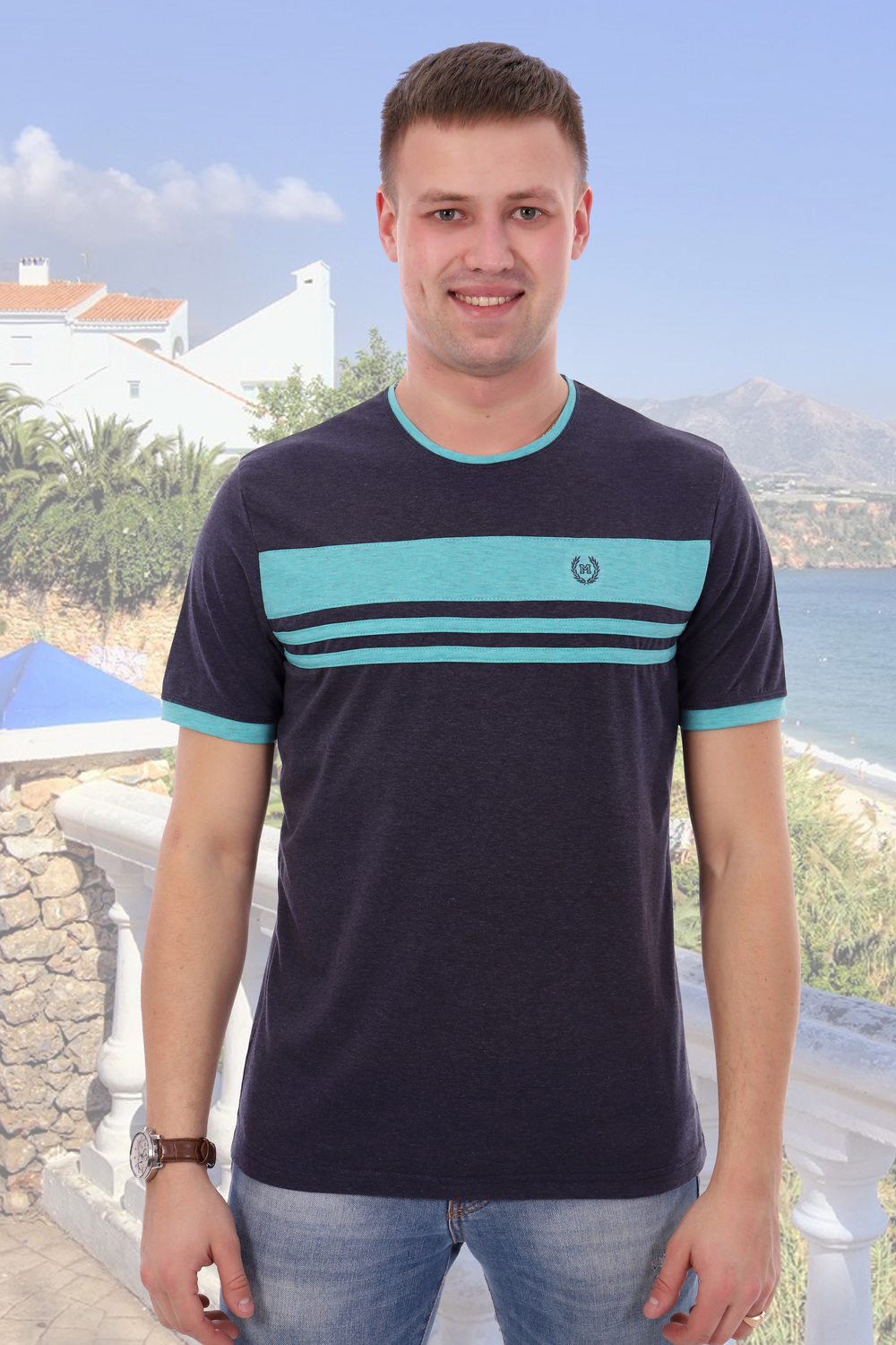 Футболка с круглым вырезом, прямого силуэта, с коротким рукавом. Рукава и горловина обработаны вставками другого цвета. Передняя полочка имеет вставки из ткани другого цвета.