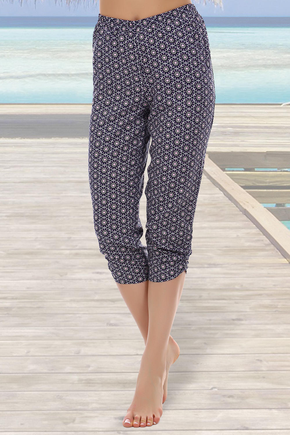Свободный покрой, верх изделия на резинке, на передних половинках внутренний карман, низ изделия подогнут, по боковому шву снизу сборка на расстоянии 12 см