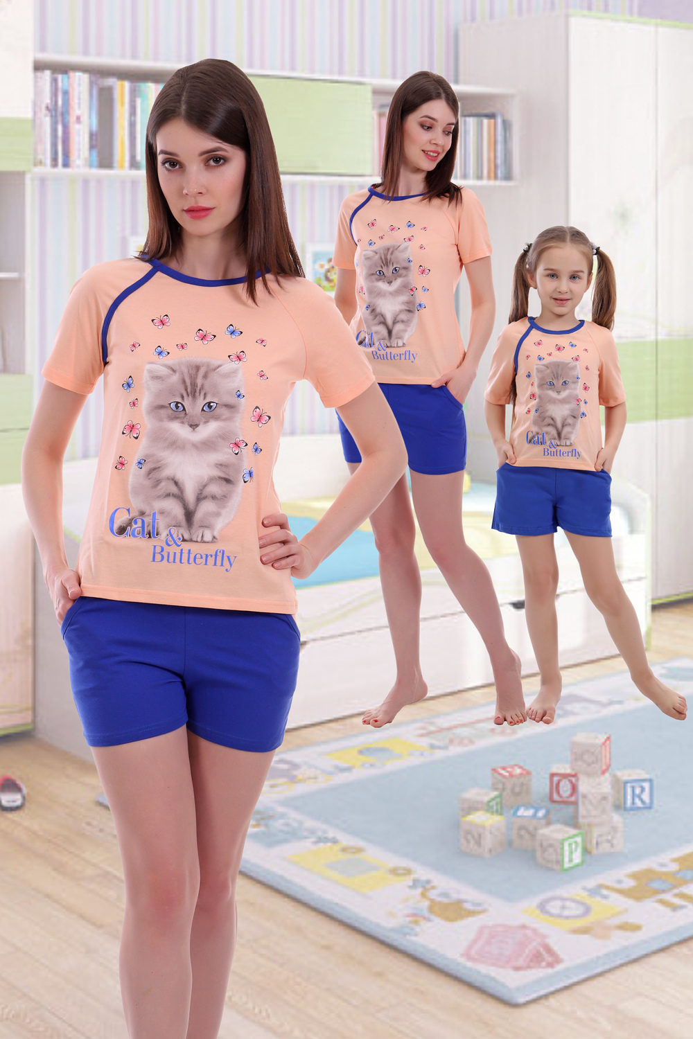 Костюм из кулирки футболка + шорты. Принт на бежевой футболке в виде котенка, бабочек и надписи, синяя окантовка. Синие однотонные шорты с карманами, длина выше середины бедра. Может быть парой детскому костюму Гималаи (продается отдельно). Размеры от 42 до 52.