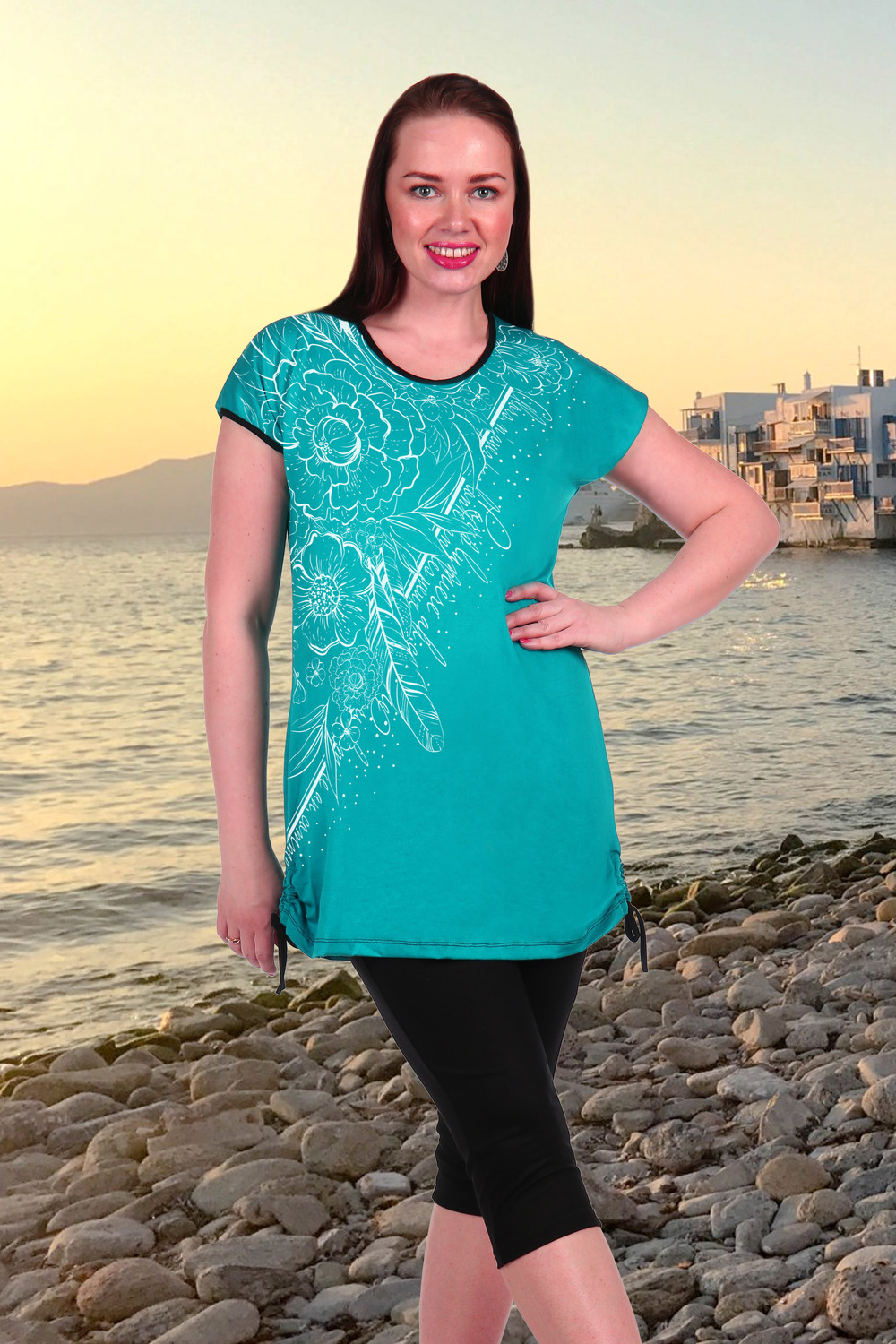 Комплект сосотоит из туники и бридж. Бриджи прилегающие, ниже колена, на резинке. Туника прямого силуэта, с округлой горловиной и спущеным плечом. В верхней части спинки расположен декоративный вырез. Горловина, проймы и вырез спинки обработаны бейкой