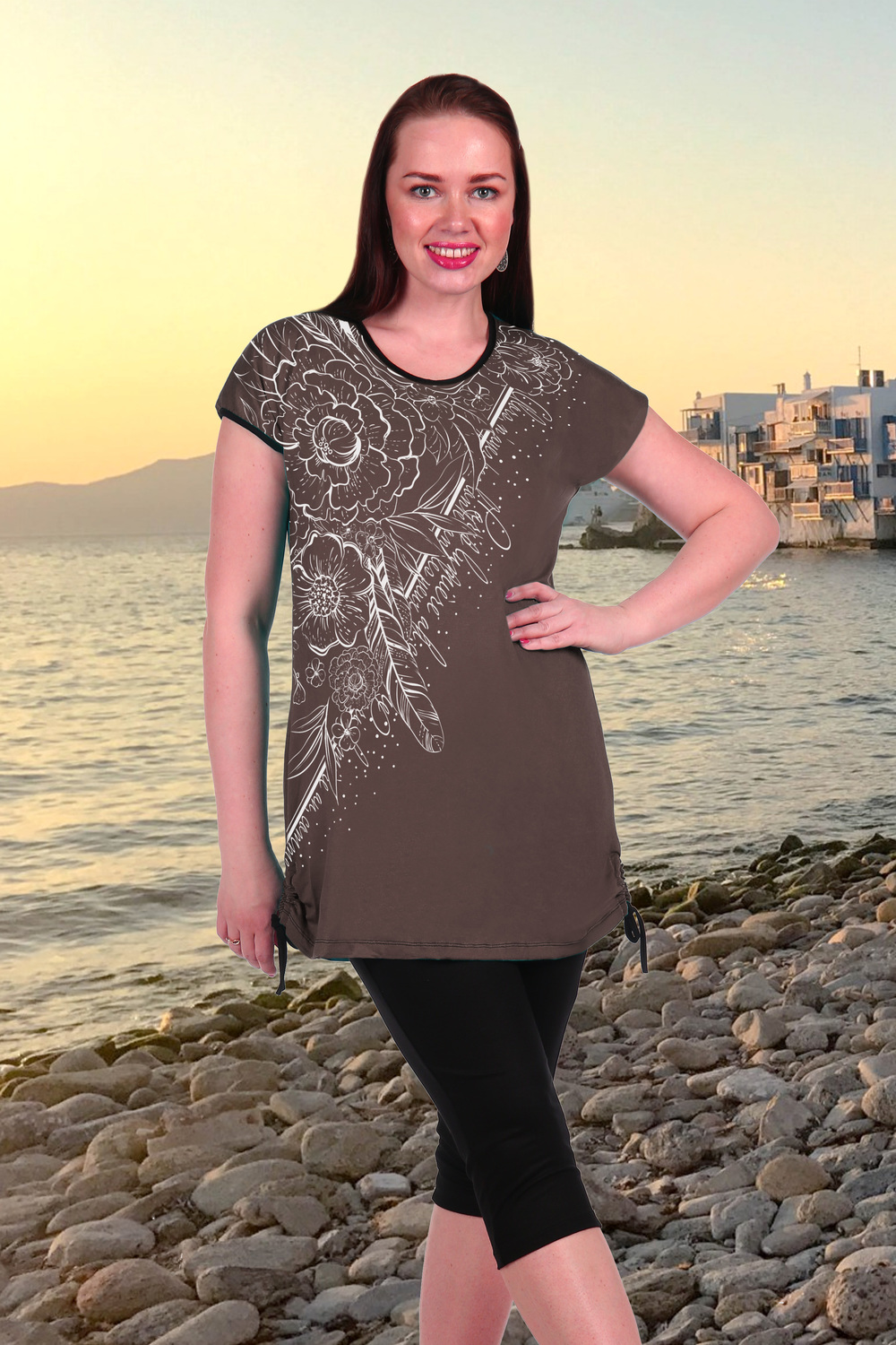 Комплект сосотоит из туники и бридж. Бриджи прилегающие, ниже колена, на резинке. Туника прямого силуэта, с округлой горловиной и спущеным плечом. В верхней части спинки расположен декоративный вырез. Горловина, проймы и вырез спинки обработаны бейкой