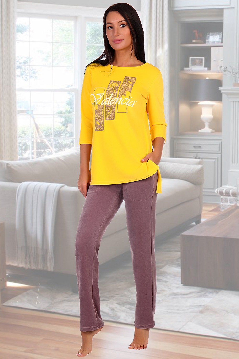 Велюровый костюм футболка с удлиненным рукавом + брюки. Принт в виде геометрических узоров и надписи. Рукава чуть ниже локтей. Несколько вариантов расцветки -- бирюзовая, желтая, малиновая, персиковая и розовая. Размеры от 44 до 54.