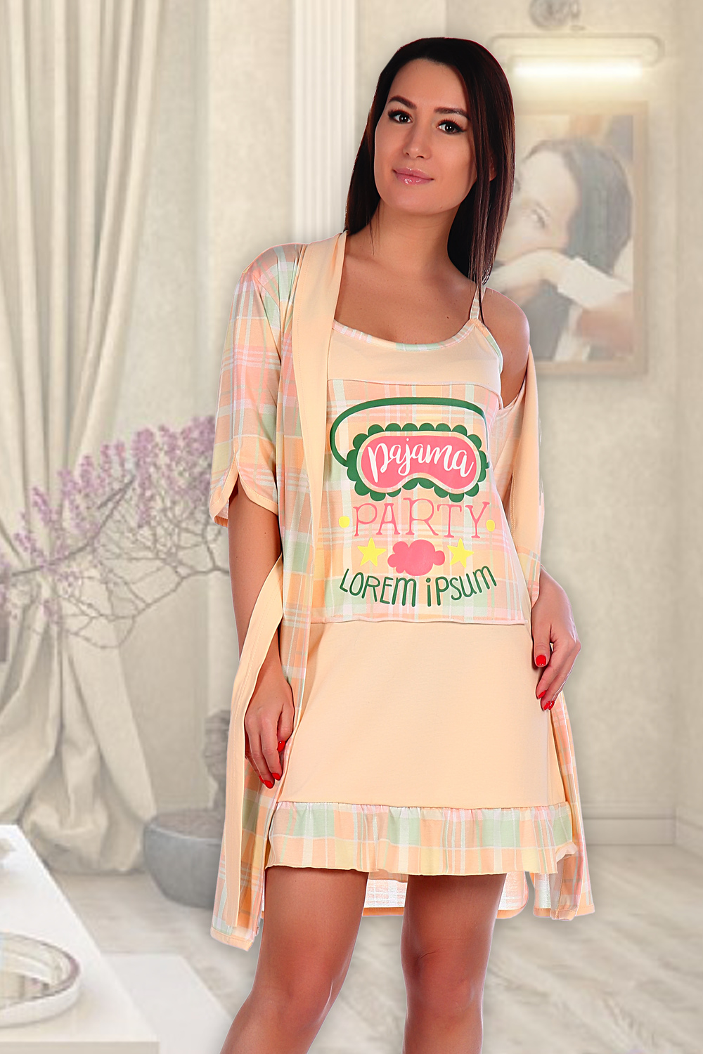 Халат запашнй с поясом. Рукав втачной 3/4. На полочке имеется накладной карман. Сорочка на бретелях, декорирована оборкой и нашивкой с контрастным принтом