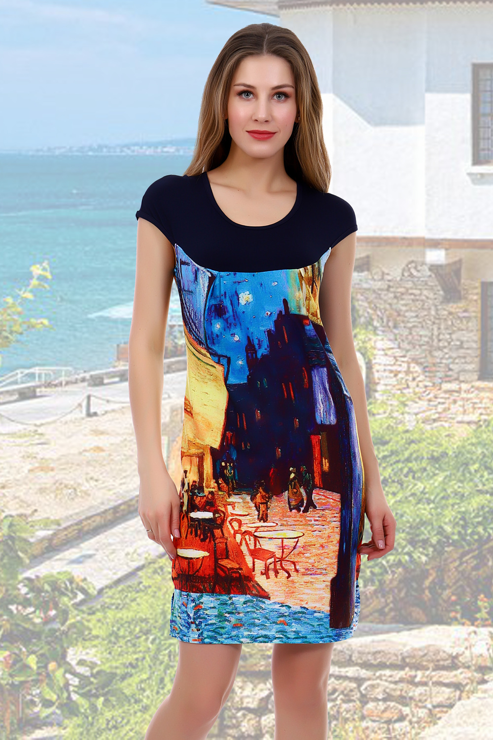 Туника женская, с однотонными кокетками на полочке и спинке, с погонами из основной ткани. Горловина круглая, рукав короткий. В боковых швах разрезы