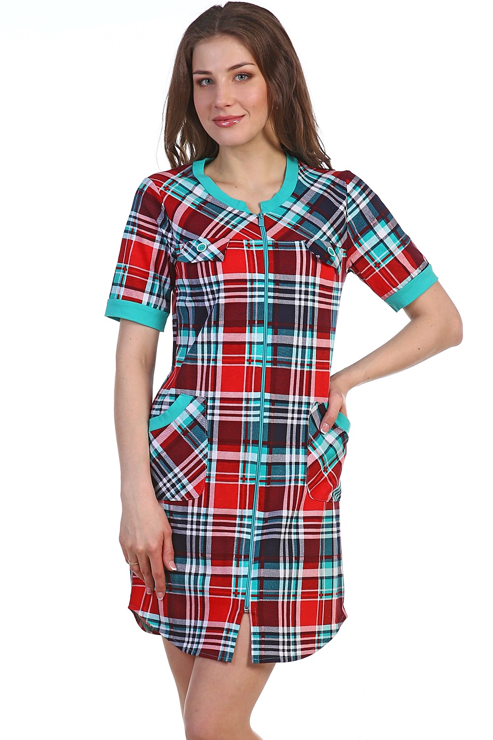 Клетчатый халат из кулирки, на молнии. Длина чуть выше колена, сбоку накладные карманы, на груди декоративные. Несколько вариантов оформления, отличающихся размером и цветовой гаммой клеток. Размеры 44-58