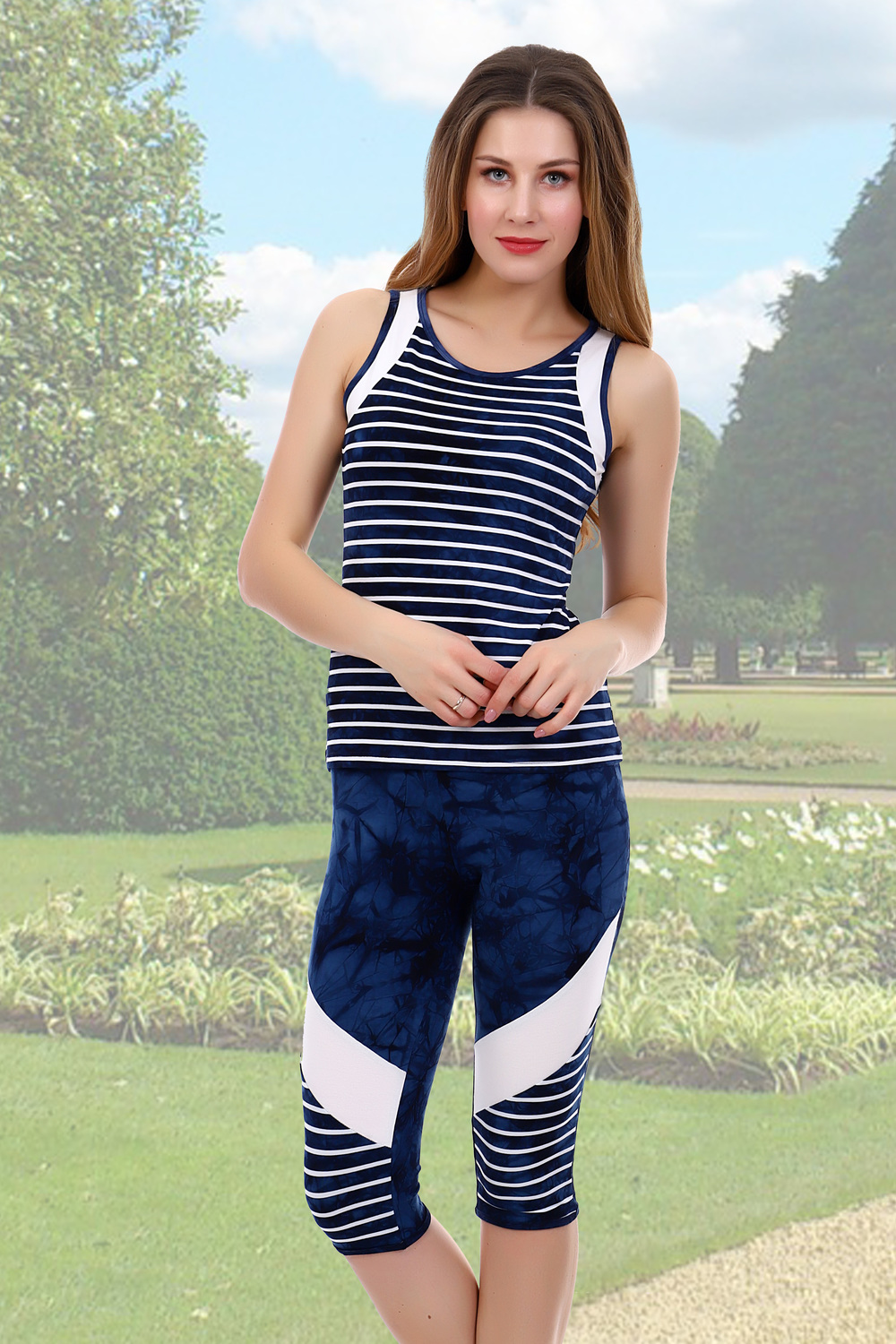 Костюм женский в спортивном стиле. Бриджи ниже колена, комбинированные, с наклонными вставками, облегающие. Майка с отрезными кокетками, с круглым вырезом горловины
