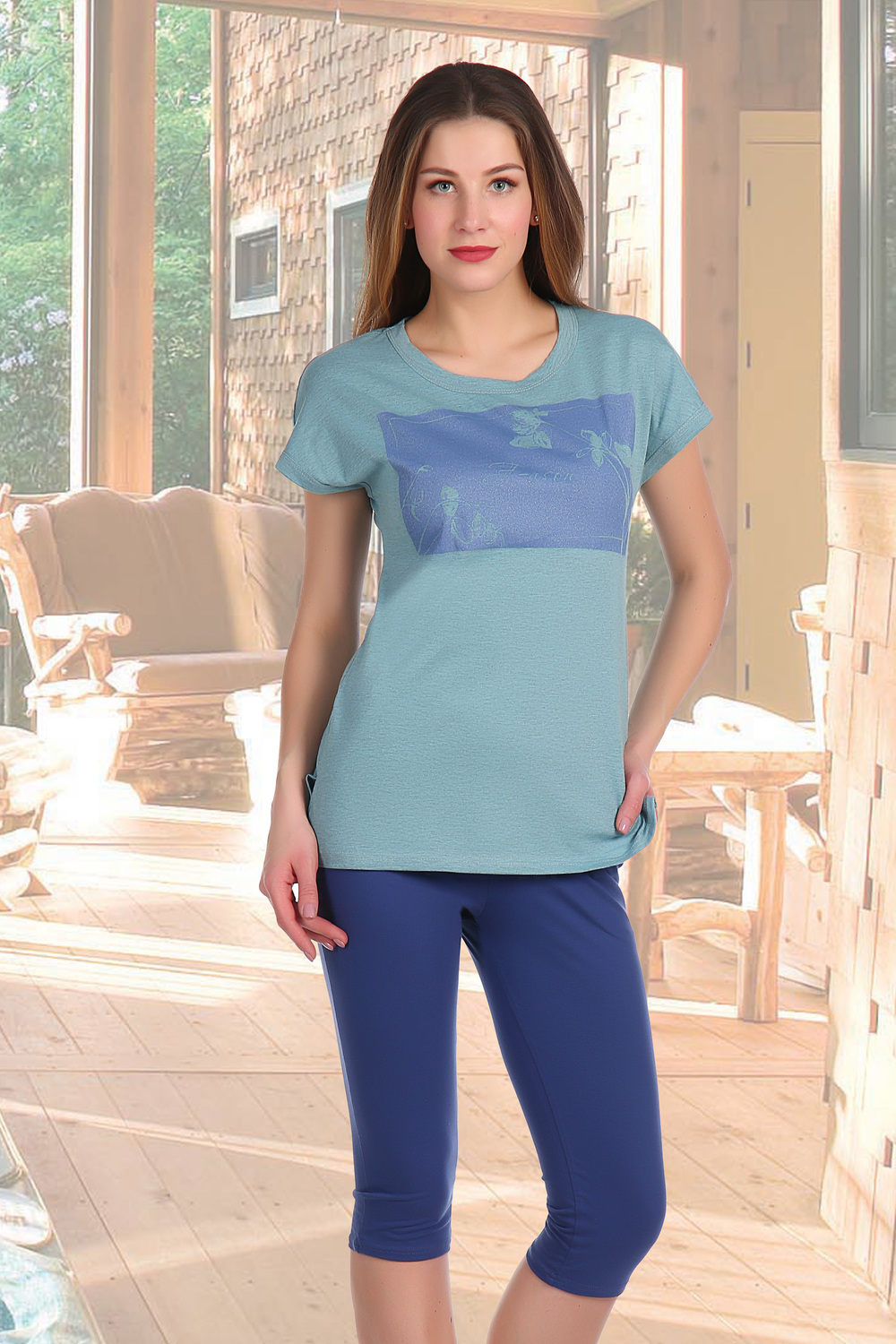 Повседневный домашний костюм. Футболка с принтом на полочке, с цельнокроенным рукавом и разрезами по бокам. Брижди средней длины и посадки с внутренними карманами. Пояс притачной