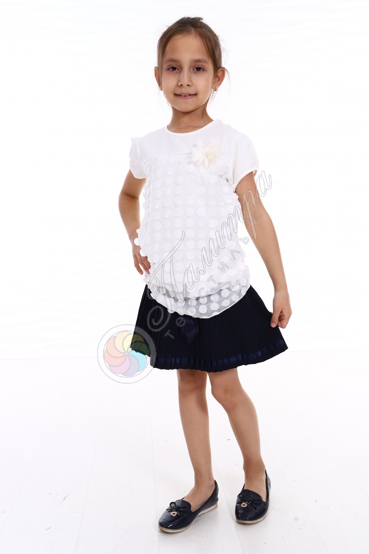 Нежная блузка для девочки с коротким рукавом из качественного эластичного хлопка. Ткань мягкая и очень приятная к телу, не садится при стирке. Отделка передней полочки шифоном с пришитыми "чешуйками" добавляет модели оригинальности и лёгкости.