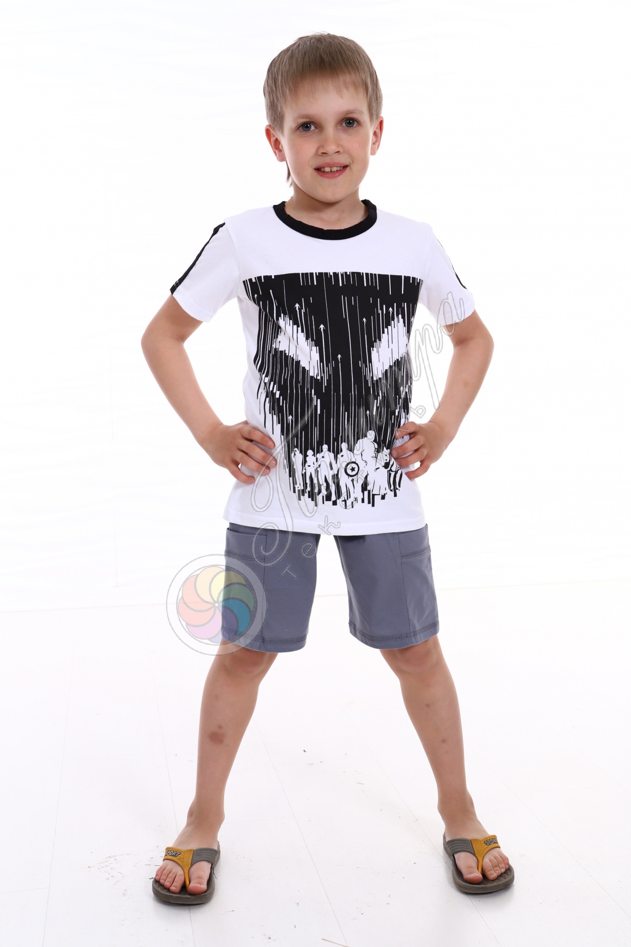 Стильная футболка с чернно-белым принтом - персонажами супергеройских комиксов. На рукавах лампасы.