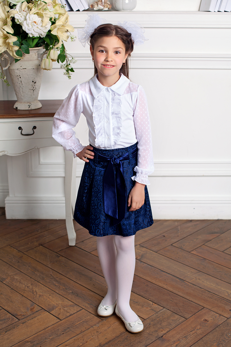 Описание: Блузка из трикотажного эластичного полотна.Длинный рукав ,кокетки и "рюш" из шифона с "жаккардовым" рисунком.Застежка на пуговицах.