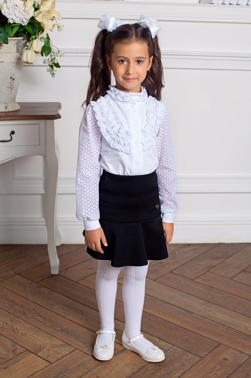 Описание: Блузка из трикотажного полотна и батиста.С воротником -стойка,украшенным "рюшем"."Рюшки",кокетливо настрочены и на полочке, длинный рукав из батиста с манжетом.