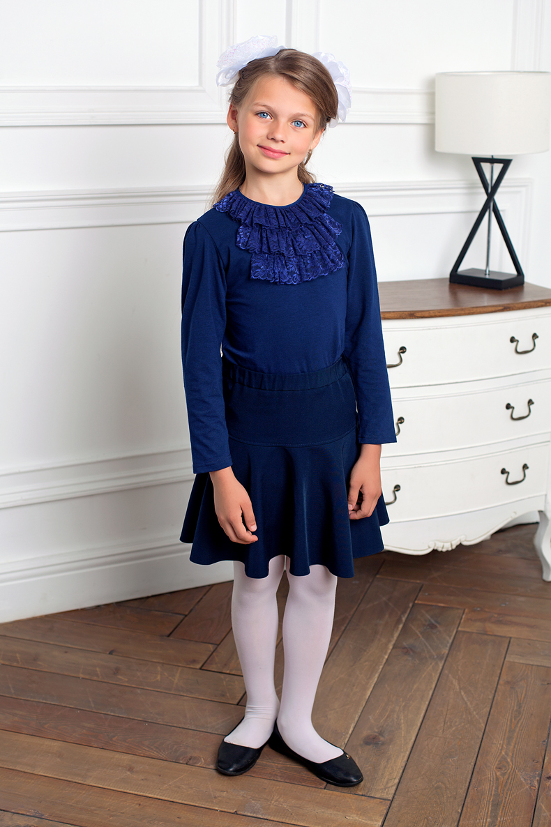 Описание: Блузка из трикотажного полотна,с округлым вырезом , по горловине расположено эластичное кружево ввиде "жабо".Длинный рукав.Рекомендована для школы.