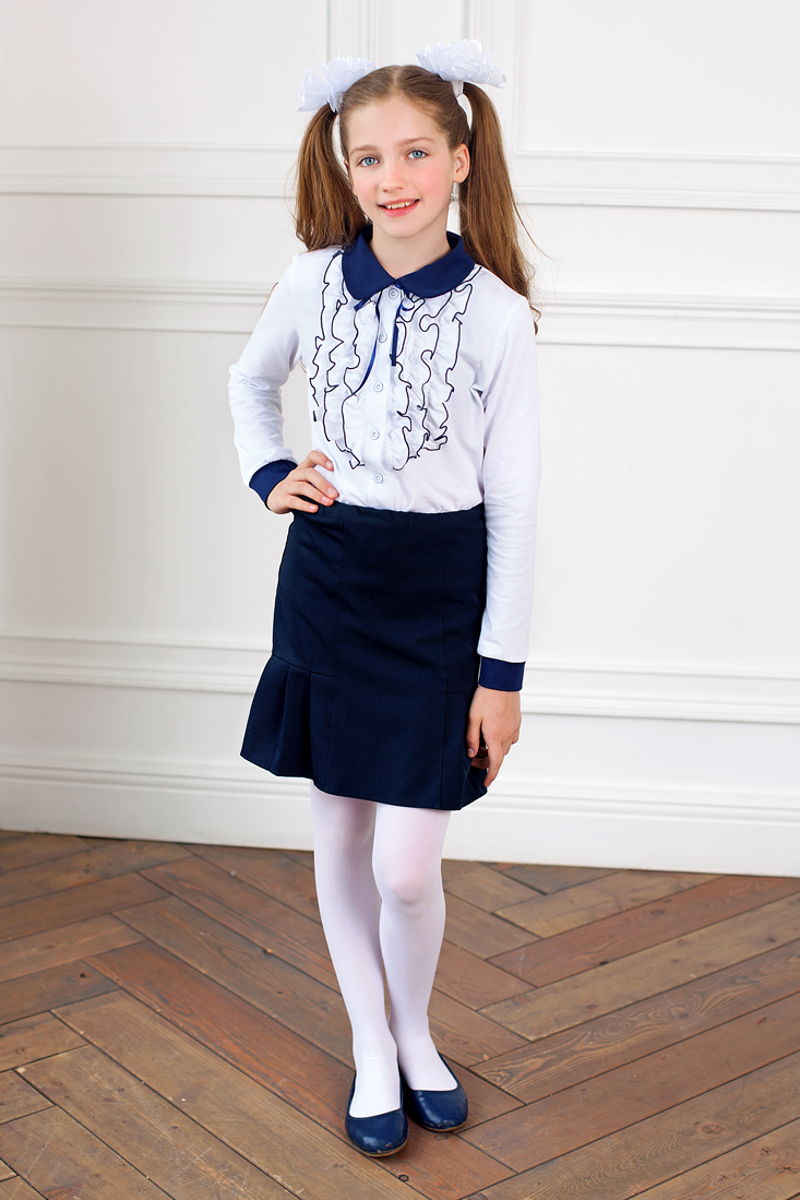 Описание: Блузка из трикотажного эластичного полотна.Воротник отложной - круглый и манжеты контрастного цвета,на полочке "рюши" из шифона ,с контрастной отделкой и бантик из атласной ленты.Празднично и красиво.Рекомендована длоя школы.