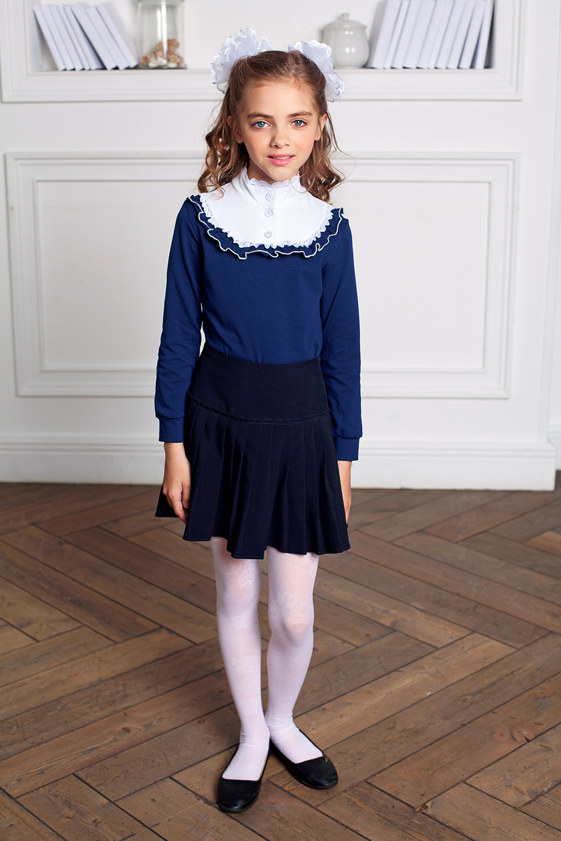 Описание: Блузка из эластичного трикотажного полотна.Кокетка и воротник-стойка украшены кружевом и изготовлены из контрастного белого трикотажа.Длинный рукав.
