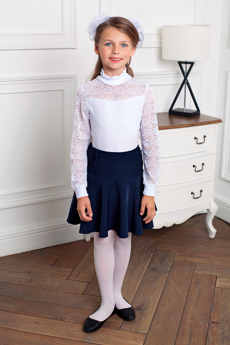 Описание: Блузка из трикотажного полотна.Выполнена ввиде водолазки с двойным воротником - стойкой.Длинный рукав и кокетка из ажурного гипюра.