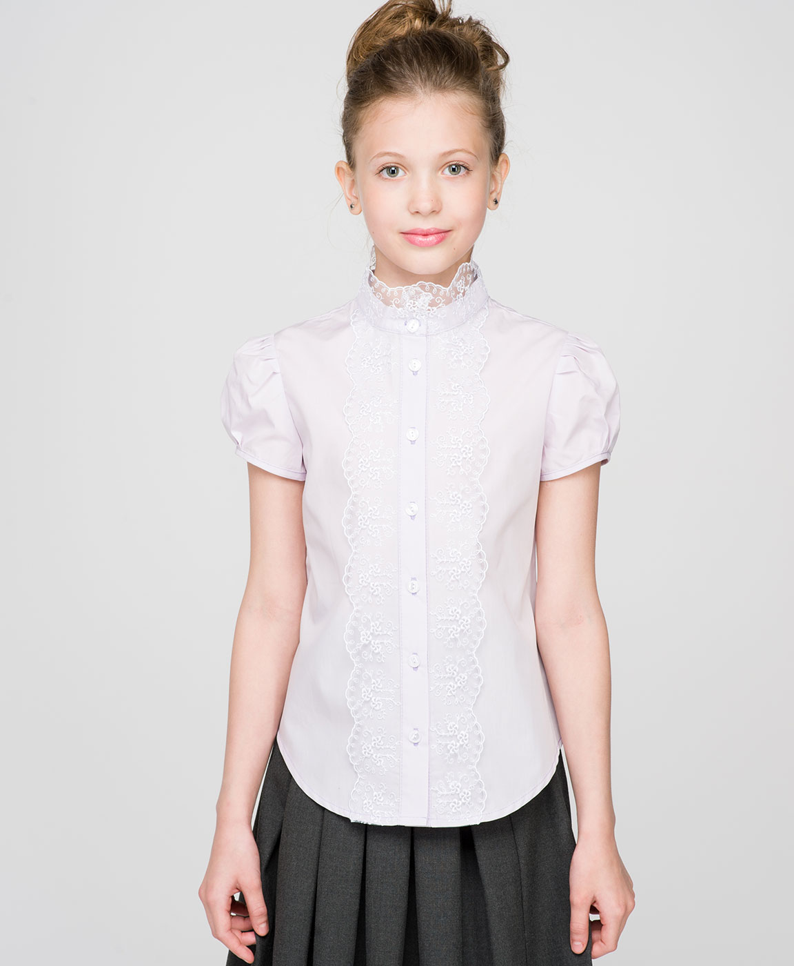 Великолепная детская блузка с коротким рукавом. Круглый воротничок, рукав фонарик. Спереди красивая рюша. Ткань блузки великолепно стирается и гладится.
