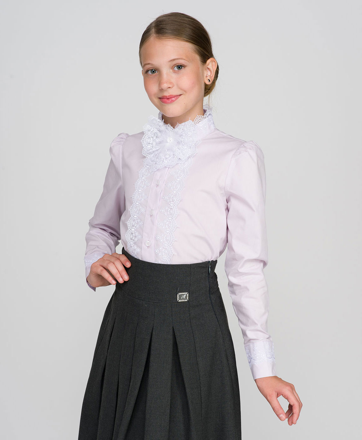 Великолепная детская блузка с длинным рукавом. Круглый воротничок, спереди рюша из гипюра, рукав фонарик.Ткань блузки великолепно стирается и гладится.