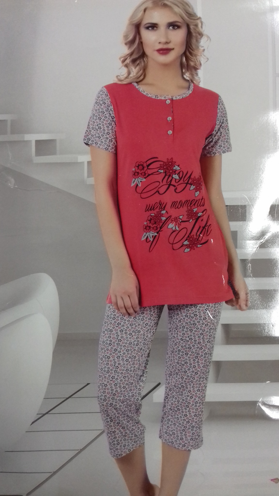 Оригинальная пижама для девушек (арт. 125) - это комфортная и стильная одежда для сна, созданная для требовательных модниц. Яркая футболка с контрастными короткими рукавами декорирована необычным принтом и тремя пуговицами на полочке у горла. Свободные брюки в три четверти длины идеально сидят по фигуре. Современная ткань великолепно держит форму и не теряет красок после многочисленных стирок.