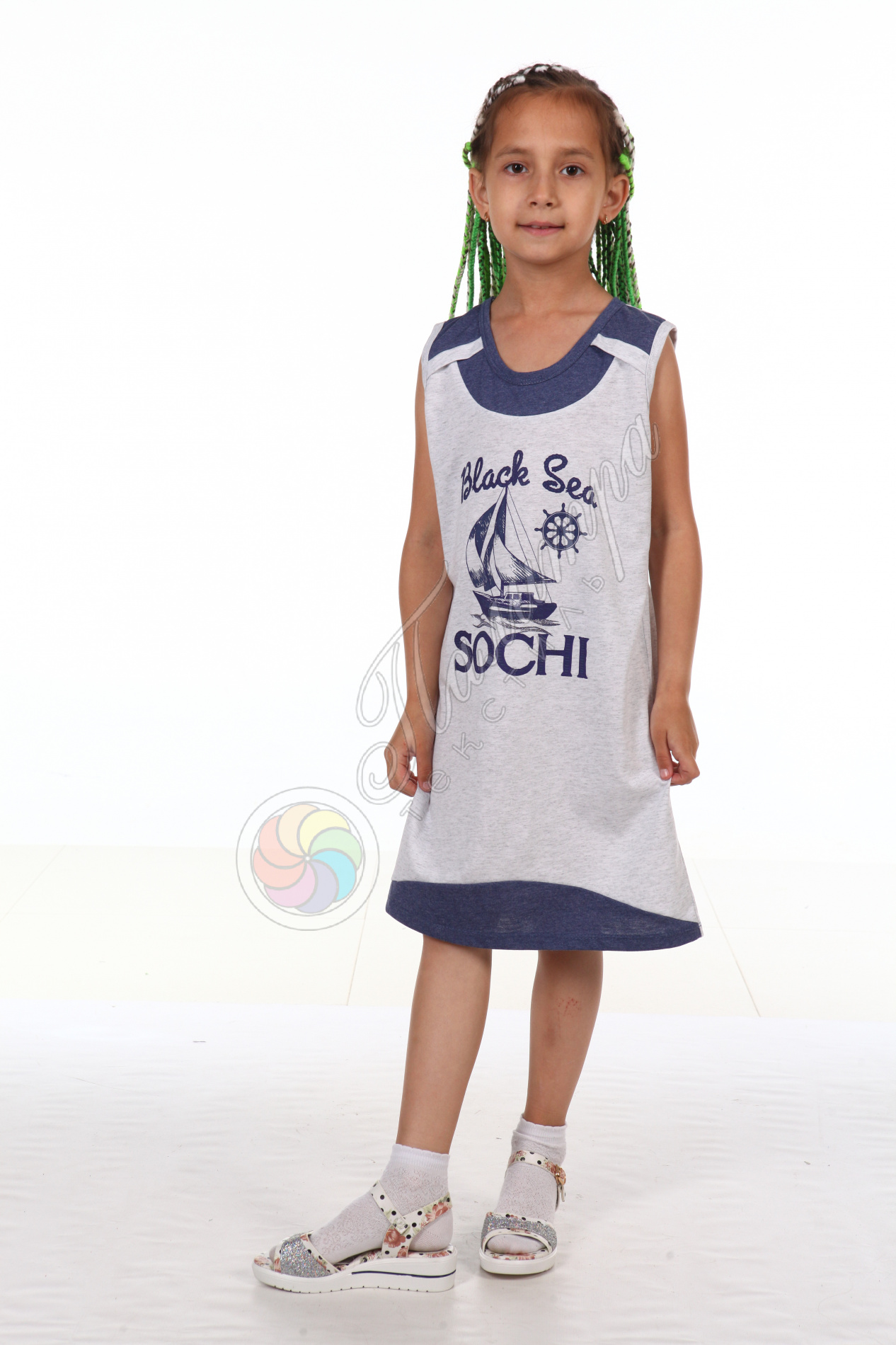 Хлопковая туника для девочек свободного фасона с комбинированными вставками, рисунок с морской тематикой смотрятся стильно и красиво. Ткань кулирка.