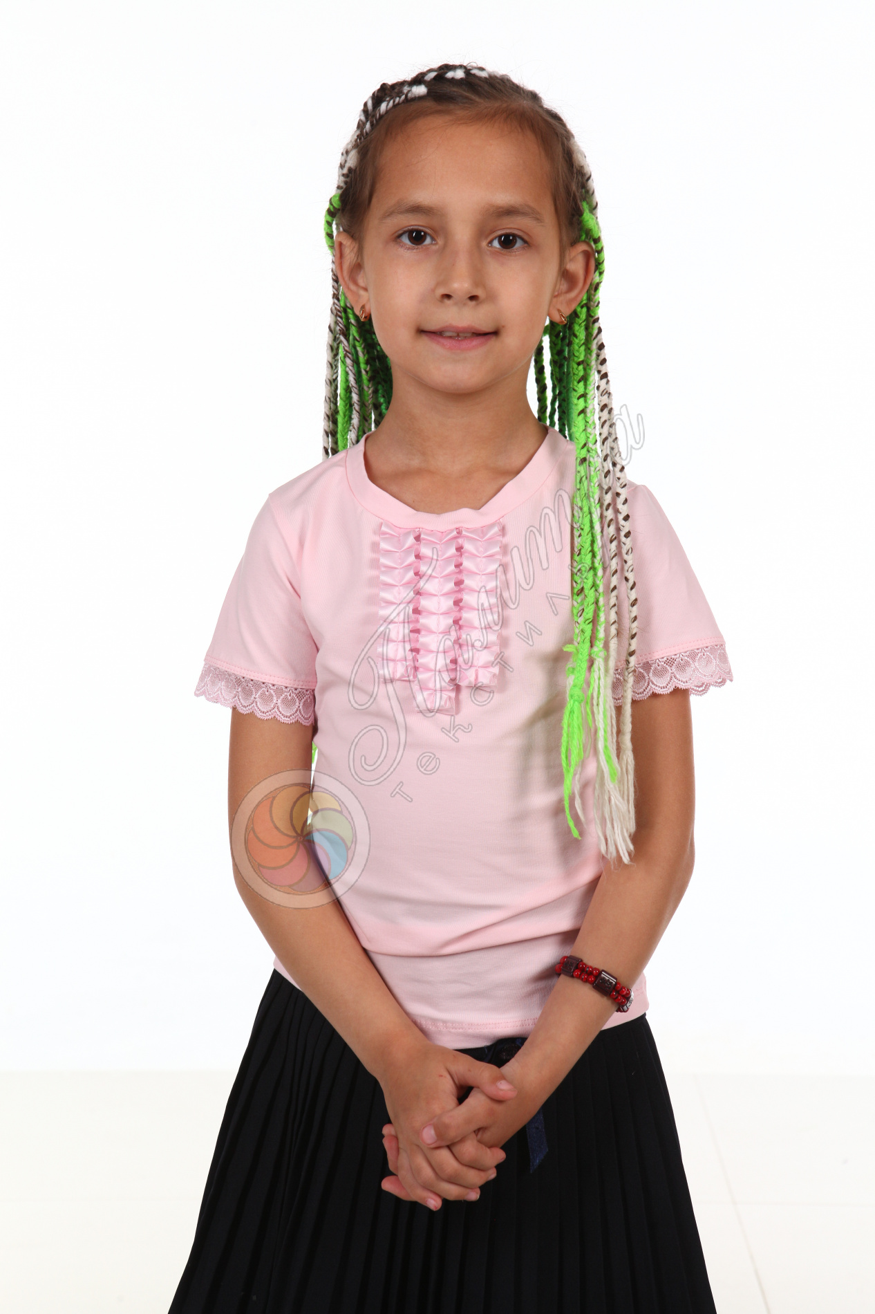 Милая блузка для девочек с коротким рукавом из мягкого эластичного хлопка. Рукав по низу украшен кружевной лентой, атласные гофрированные ленты, создают имитацию воротничка-жабо, что придаёт элегантности этой модели. Ткань кулирка с лайкрой, очень мягкая и приятная к телу.