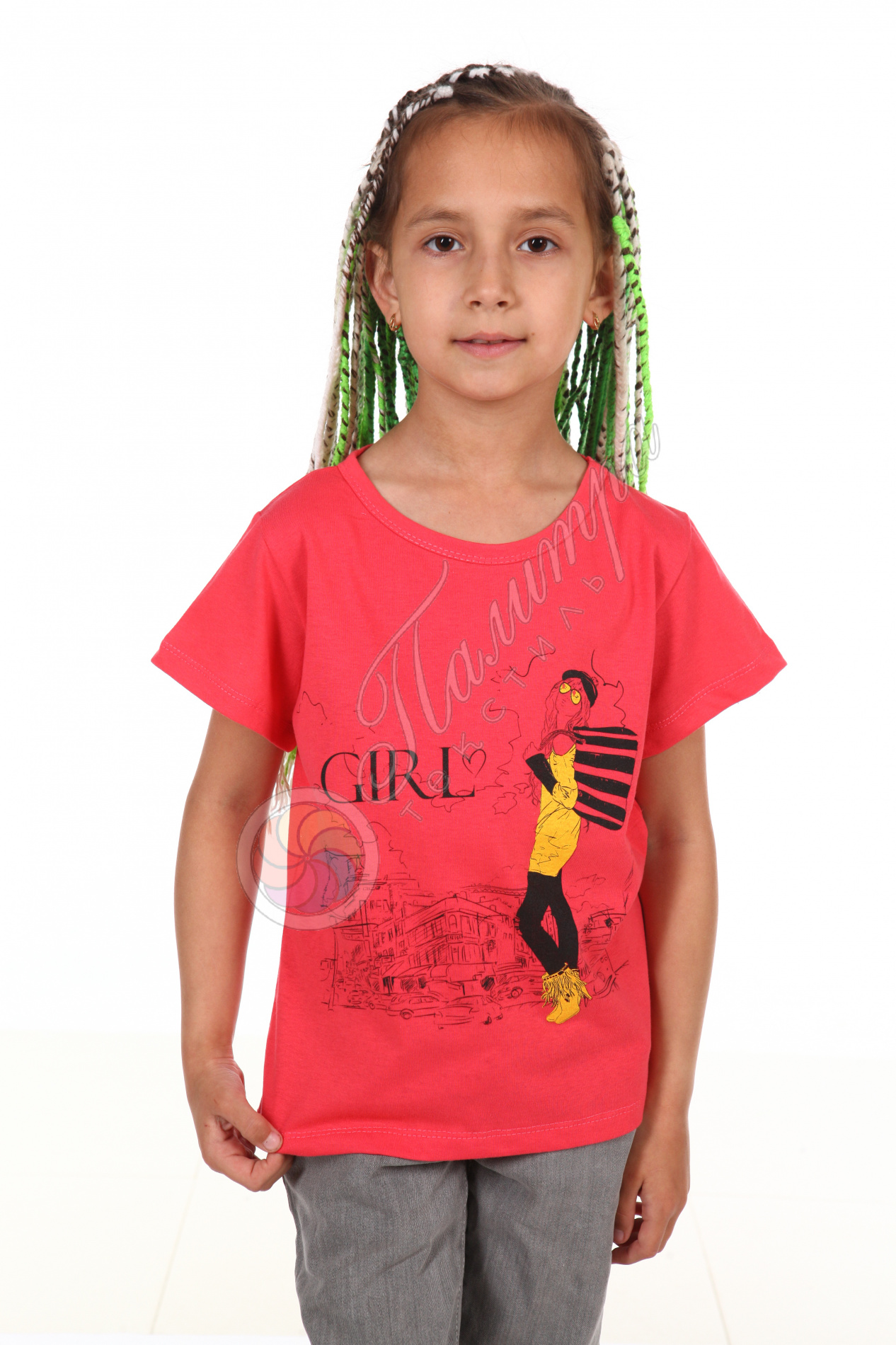 Свободная хлопковая футболка для девочек с модным и стильным принтом. Модель с удлинённой спинкой и округлым низом. Ткань кулирка.