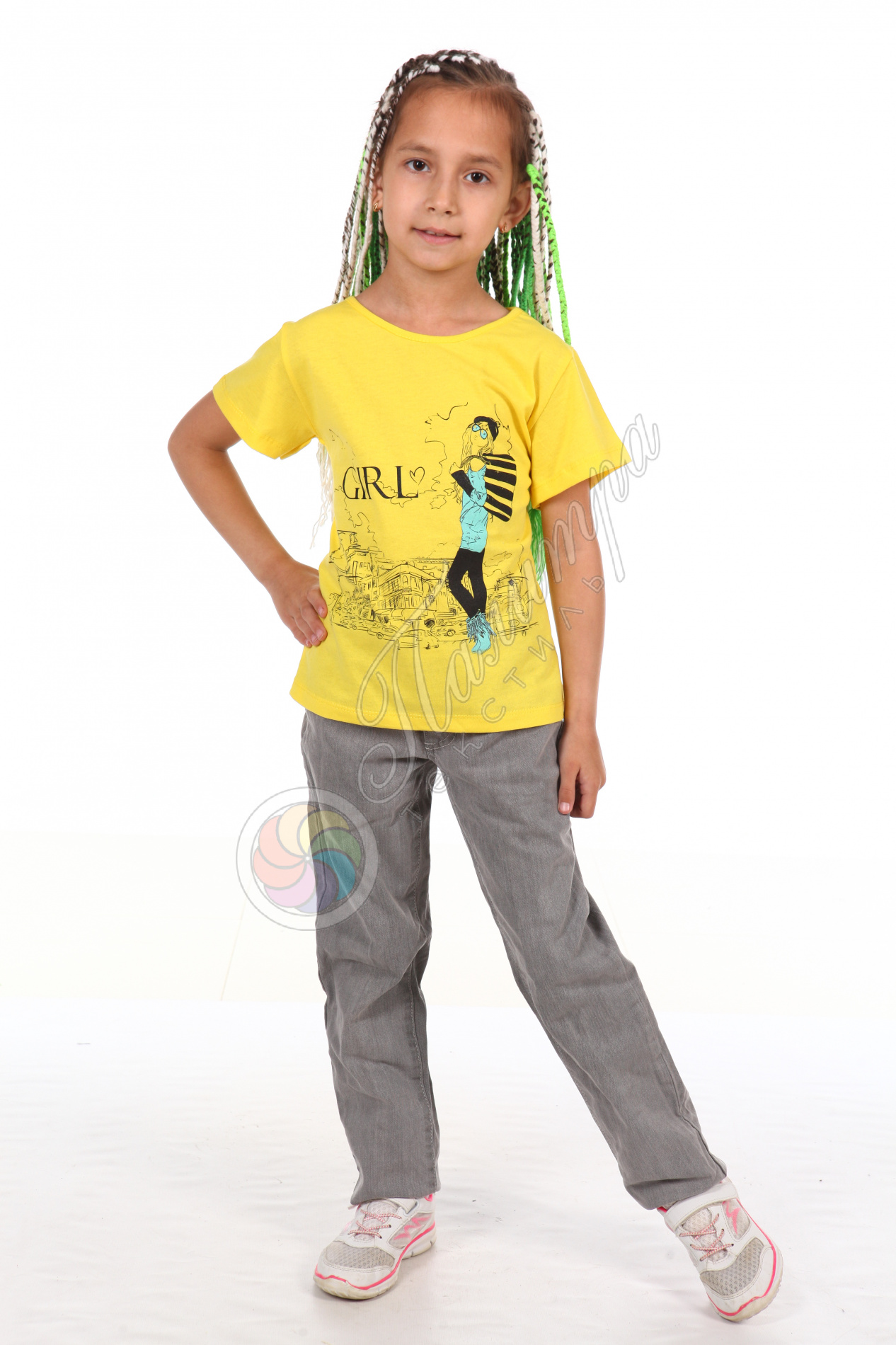 Свободная хлопковая футболка для девочек с модным и стильным принтом. Модель с удлинённой спинкой и округлым низом. Ткань кулирка.