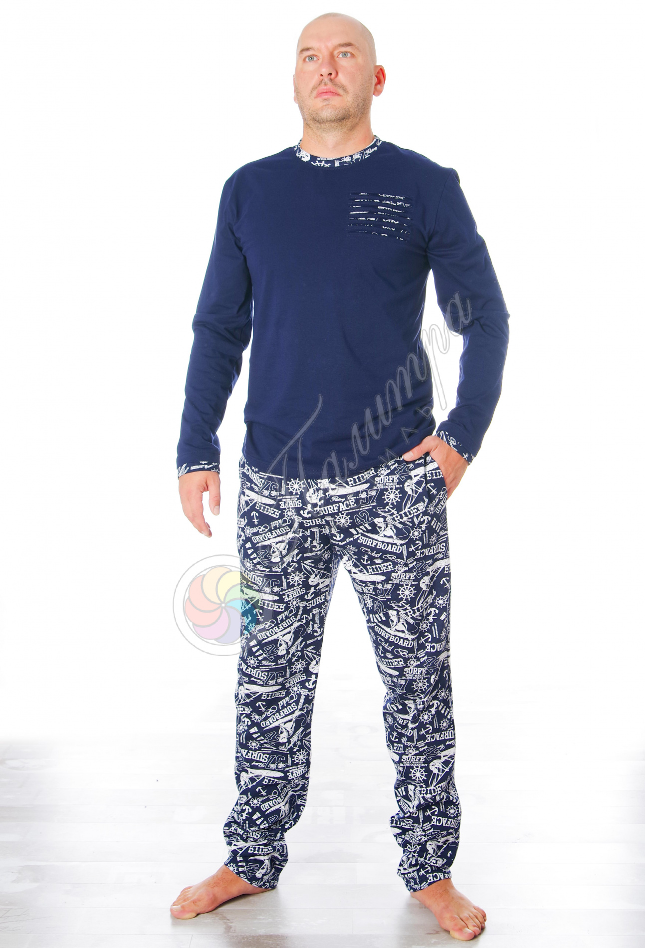 Удобный домашний костюм для мужчин, которые хотят выглядеть стильно даже дома! Ткань мягкая и приятная к телу, кулирное полотно. Брюки зауженные с боковыми карманами, пояс на резинке, футболка с длинным рукавом прямого кроя, горловина и рукава окантованы в тон брюк, на полочке декоративная деталь. Подойдёт в качестве пижамы.